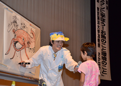 子供を壇上に招き、楽しい会話をしながらイラストを完成させるさかなクン |