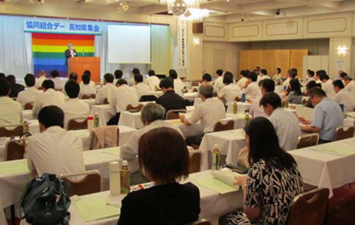 2011年7月15日(金)、高知商工会館で「国際協同組合デー」が開催され、県内協同組合の役職員約100人が参加しました。この集会は、県の生協連・JAグループ・漁連・森林連が主催者となっています。