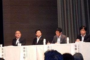 続く二つ目のパネルディスカッションは、「協同組合間連携を通じて持続可能な社会へ」と題して、協同組合間連携による先進的な取組み事例を紹介。まずJA鹿児島きもつきの下小野田寛組合長が、当地の協同組合(JA・漁協・森林組合)が連携して地域産業の活性化に取り組む「かのや農林漁業協同組合連絡協議会」の活動について報告しました。続いて一般社団法人埼玉県労働者福祉協議会の永田信雄専務と埼玉県生活協同組合連合会の岩岡宏保会長は、県内の協同組合が共同でフードバンクを運営し、地域社会に貢献している「NPO法人フードバンク埼玉」の取り組みを紹介。さらに日本労働者協同組合連合会センター事業団中四国事業本部の竹森鉄本部長は、広島市からの委託を受けたワーカーズコープがJA広島中央会・広島県生協連・中国労働金庫・連合広島等と連携しつつ、自ら仕事をおこして地域課題の解決を目指す市民を支援する「協同労働プラットフォーム事業」について報告しました。コーディネーターは引き続き田中会長が務め、コメンテーターには一般社団法人SDGs市民社会ネットワークの黒田かをり代表を迎えて、それぞれの事例の意義を「持続可能な開発目標」(SDGs)の視点から検討することにより、協同組合間連携のさらなる促進がSDGsの実現、すなわち持続可能な地域づくりに重要な役割を果たし得ることが確認されました。