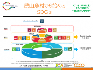 講演では、クイズ形式でSDGsの概要をお伝えました。SDGsウェディングケーキモデルを紹介し、「自然資本」に働きかける農山漁村の皆さまがSDGsに取り組む意義やメリットについて紹介しました。またSDGs達成のためには、担い手の半分を占める女性の声を反映させた自発的、創作的な取り組みが重要であると強調しました。