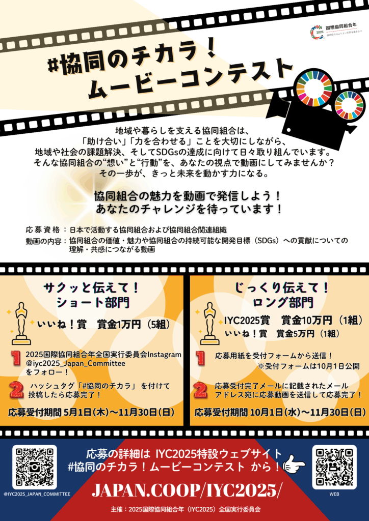 地域や暮らしを支える協同組合は「助け合い、力を合わせること」を大切にし、社会のさまざまな課題に取り組み、持続可能な開発目標(SDGs)に貢献しています。そうした協同組合の取り組みを、動画で表現し、その価値や魅力を社会全体に発信していくために、「協同組合がよりよい世界を築く~チャレンジムービーコンテスト2025」(略称「協同組合のチカラ!ムービーコンテスト」)を実施します。