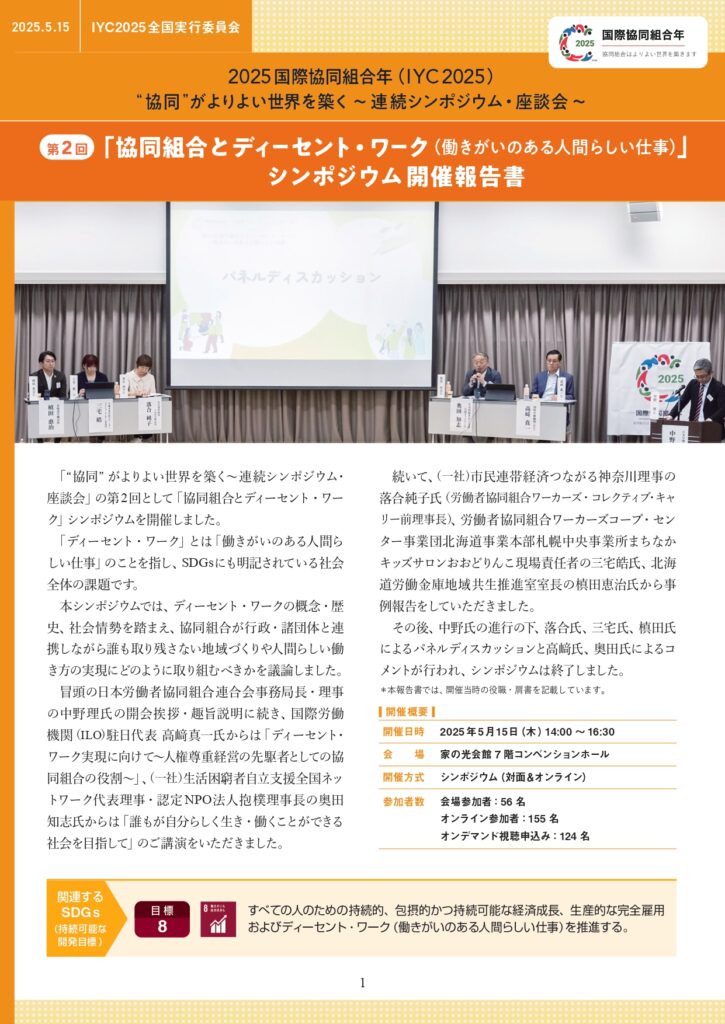 “協同”がよりよい世界を築く~連続シンポジウム・座談会の第2回として、2025年5月15日(木)に開催しました「協同組合とディーセント・ワーク(働きがいのある人間らしい仕事)」の詳細な開催報告書を公開いたしました。登壇者資料や動画とあわせてご覧ください。
