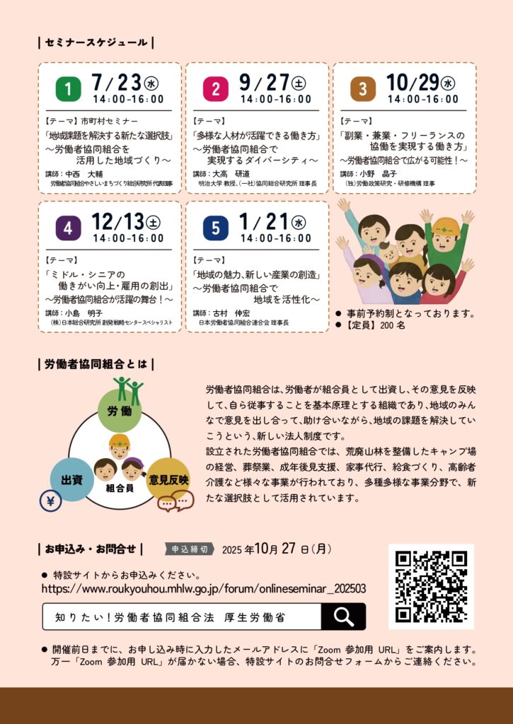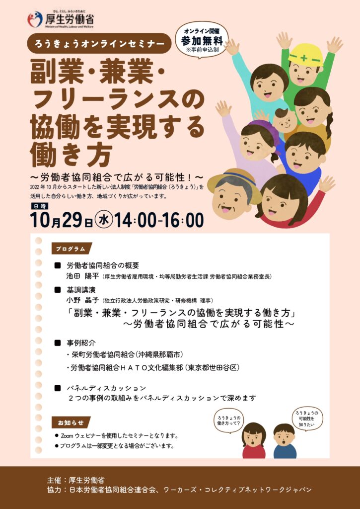 厚生労働省が主催し、当機構会員の日本労働者協同組合連合会とワーカーズ・コレクティブネットワークジャパンが協力する「第3回 ろうきょうオンラインセミナー」が開催されます。