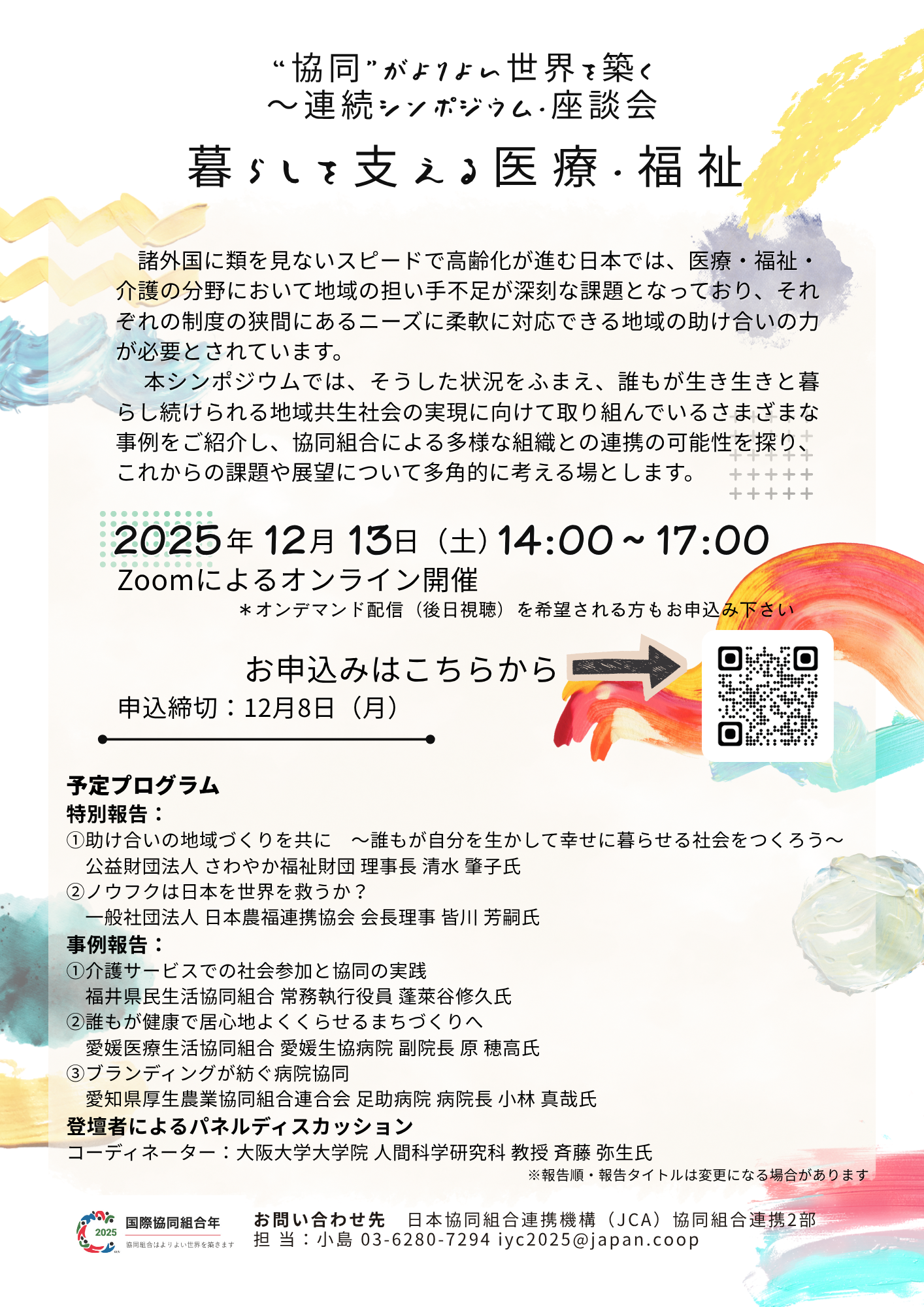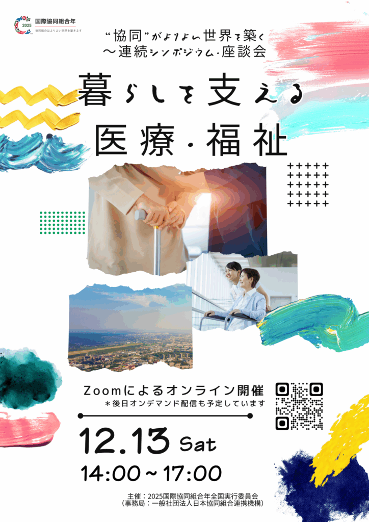 2025国際協同組合年の取り組みの一つとして、連続シンポジウム・座談会 第9回「暮らしを支える医療・福祉」を下記のとおり開催いたします。