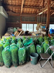 出荷時は、専用の袋に苗を入れます。梱包時は緑だが、移植する際には杉は茶色に変色するそうです。本年度の杉の出荷は、福井県内向けに14,000本です。