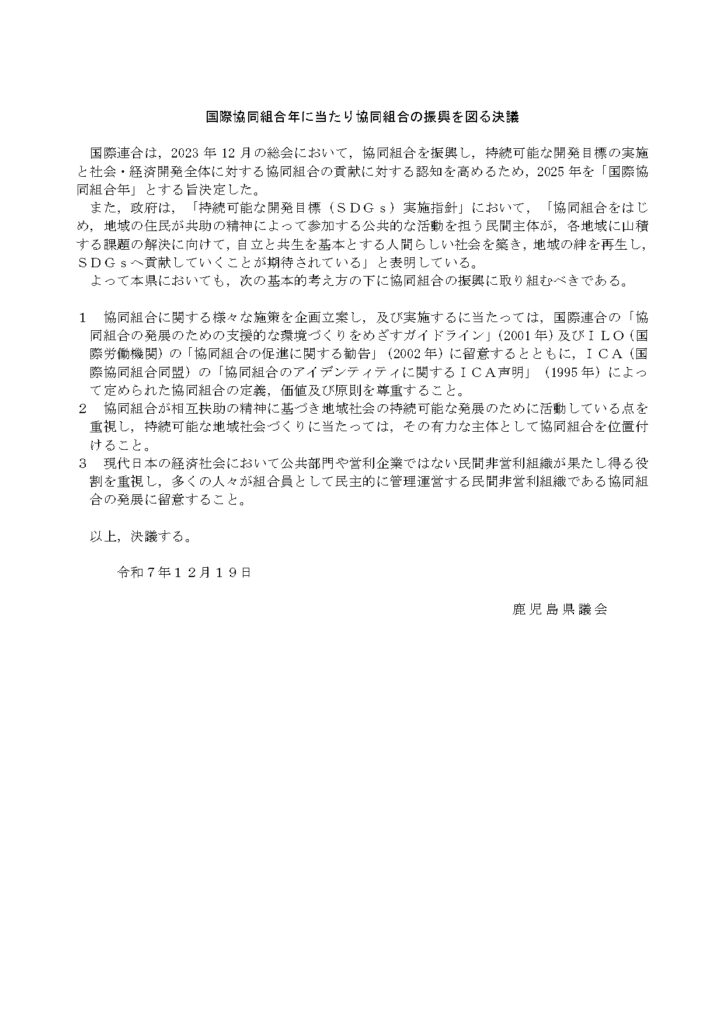 2025年12月19日、鹿児島県議会において国連が2025年を「国際協同組合年」と定めたことを受け、「国際協同組合年に当たり協同組合の振興を図る決議」が採択されました。
