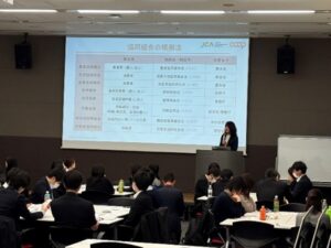 本研修は、入会・入社3年目の職員・社員を対象に、2026年1月19日(月)~21日(水)までの3日間にわたって実施されました。JCAは、最終日の1月21日(水)に行われた「協同組合のこれから」の単元を担当し、約40名が受講しました。
