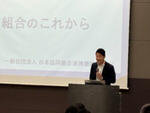 前半の講義には、丹後真一マネージャーおよび小島愛美連携推進マネージャーが登壇し、IYC2025の振り返りやJCA2030ビジョンを紹介するとともに、参加者一人ひとりが「協同組合のこれから」を担う大切な存在であることを伝えました。